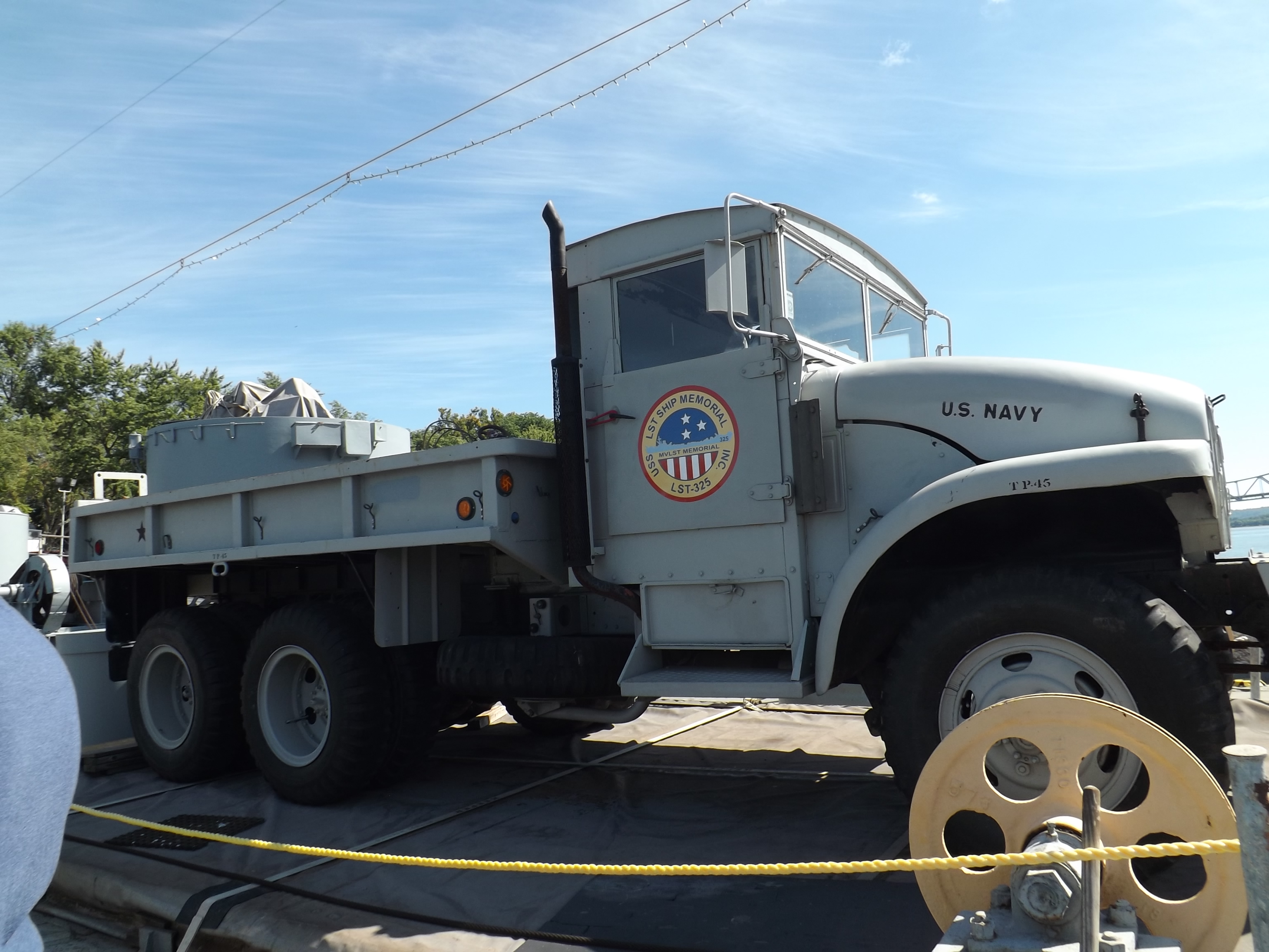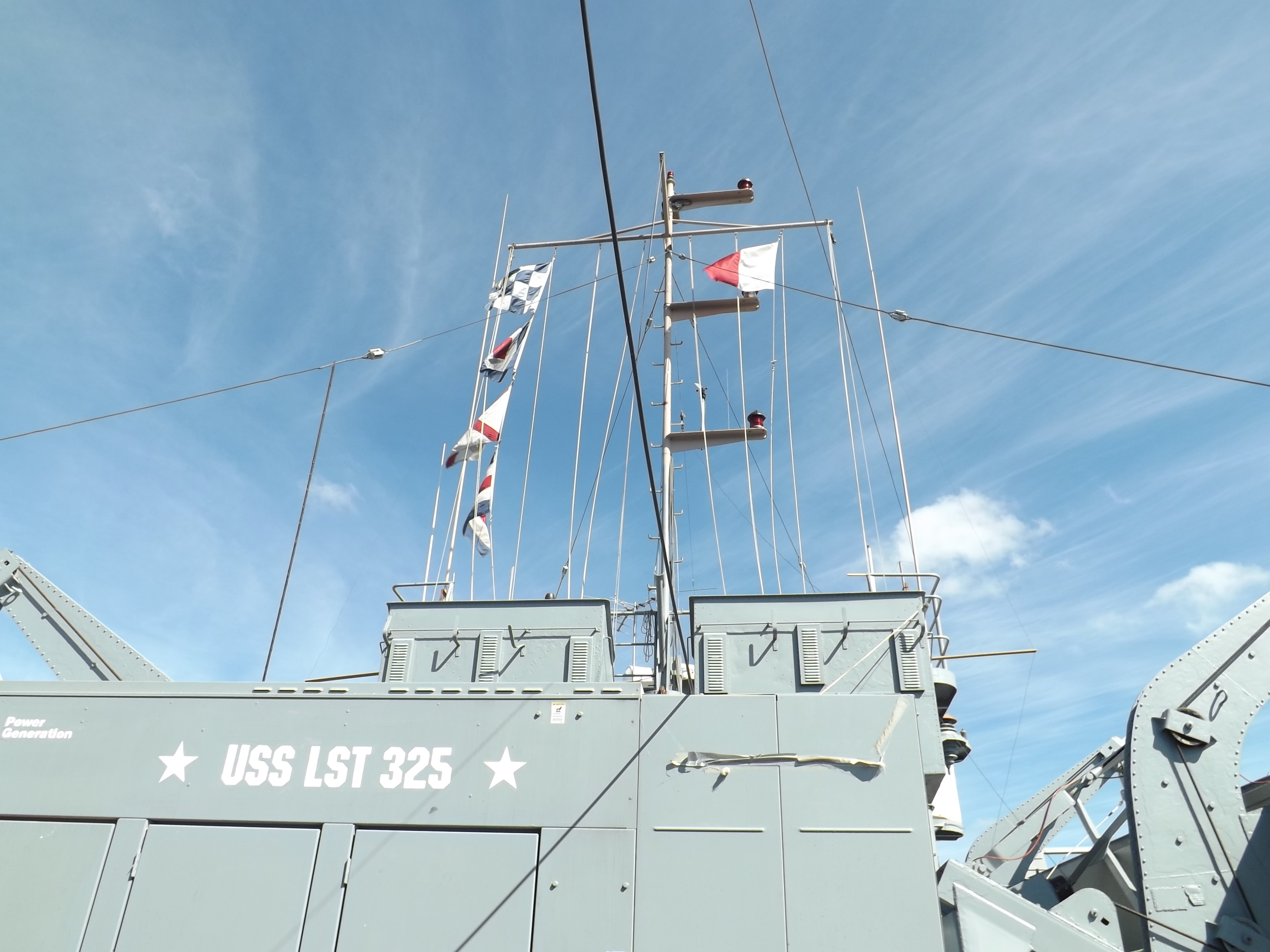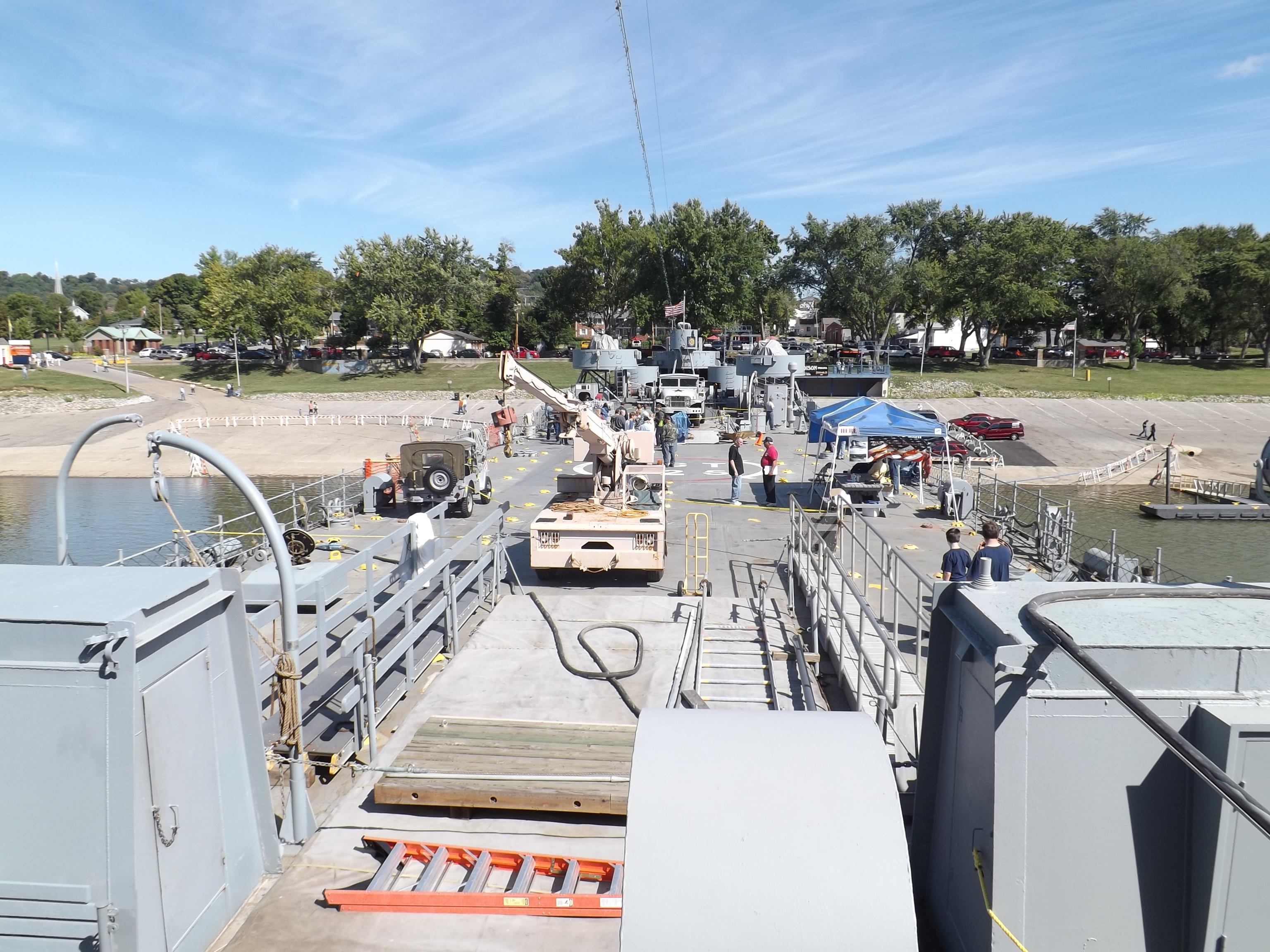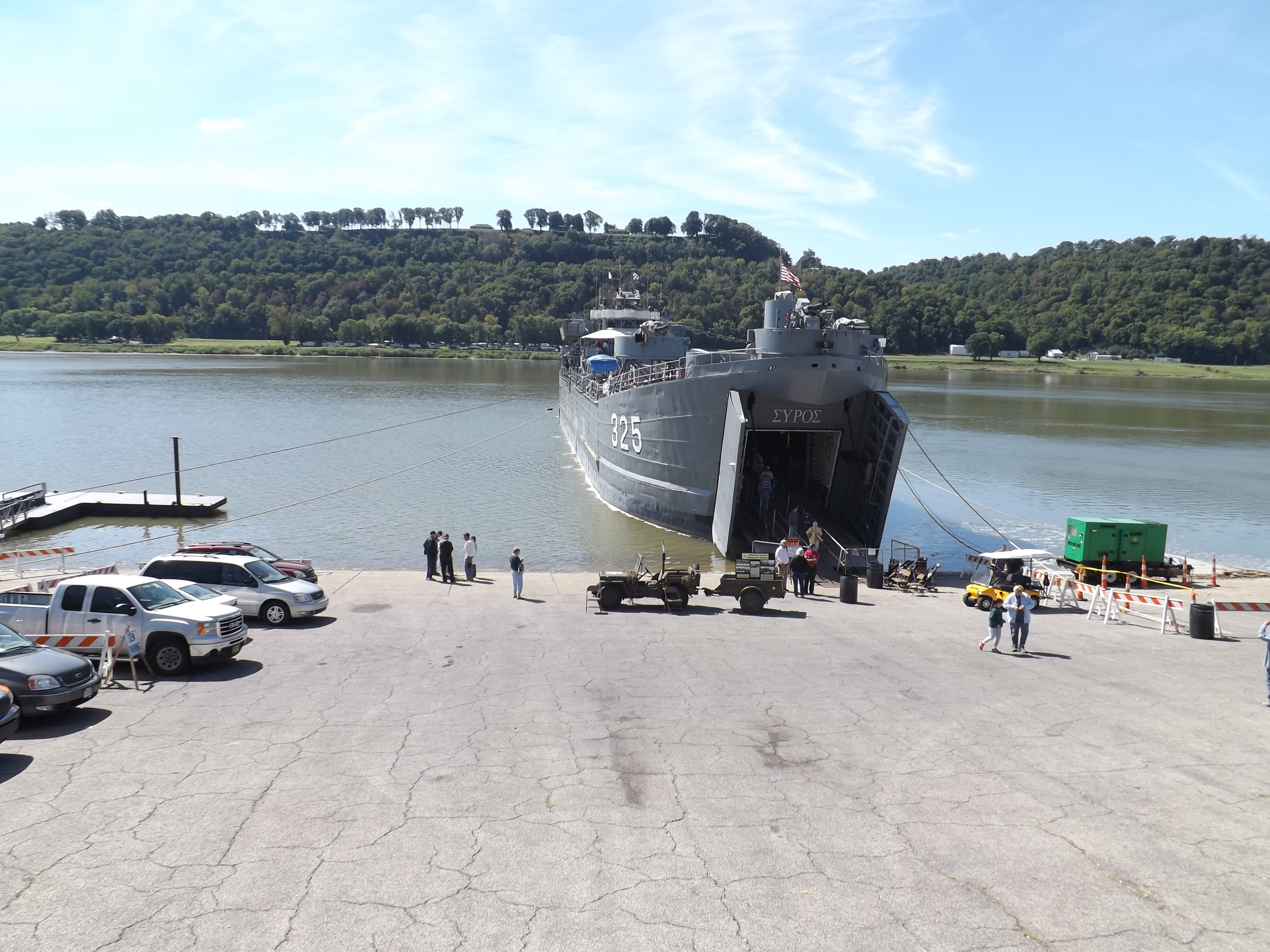 The LST-325 docked for tours at Madison, Indiana on 09/14/2013. This LST (Landing Ship, Tank) was used on D-Day +1 to offload tanks, trucks, jeeps, and troops at Omaha Beach and to transport injured soldiers back to England for care. It was utilized in Korea & Vietnam before being decommissioned and sold to the Greek government. When the Greeks were ready to scrap it, it was purchased by a group of veterans who have worked to restore her as she was during World War II. Her home port is Evansville, IN, but she sails during the summer so that others may board her and explore a piece of history.