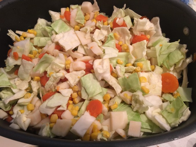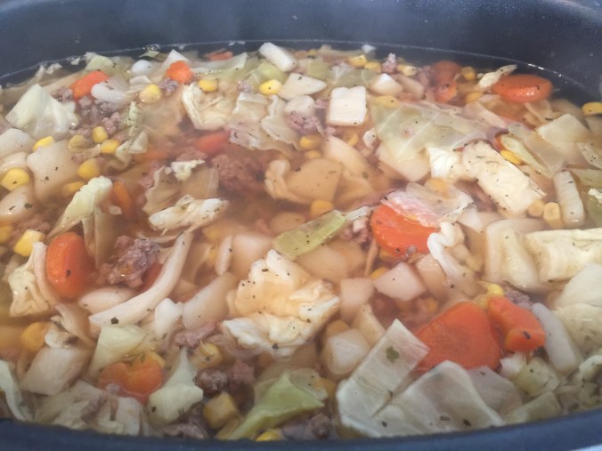 Drain and rinse the carrots, corn, and potatoes. (There are very few actual uses for canned potatoes, but slow-simmered soup helps take the “canned” taste away.) Rough-chop the cabbage. I tossed that all into my slow-cooker and mixed it up.