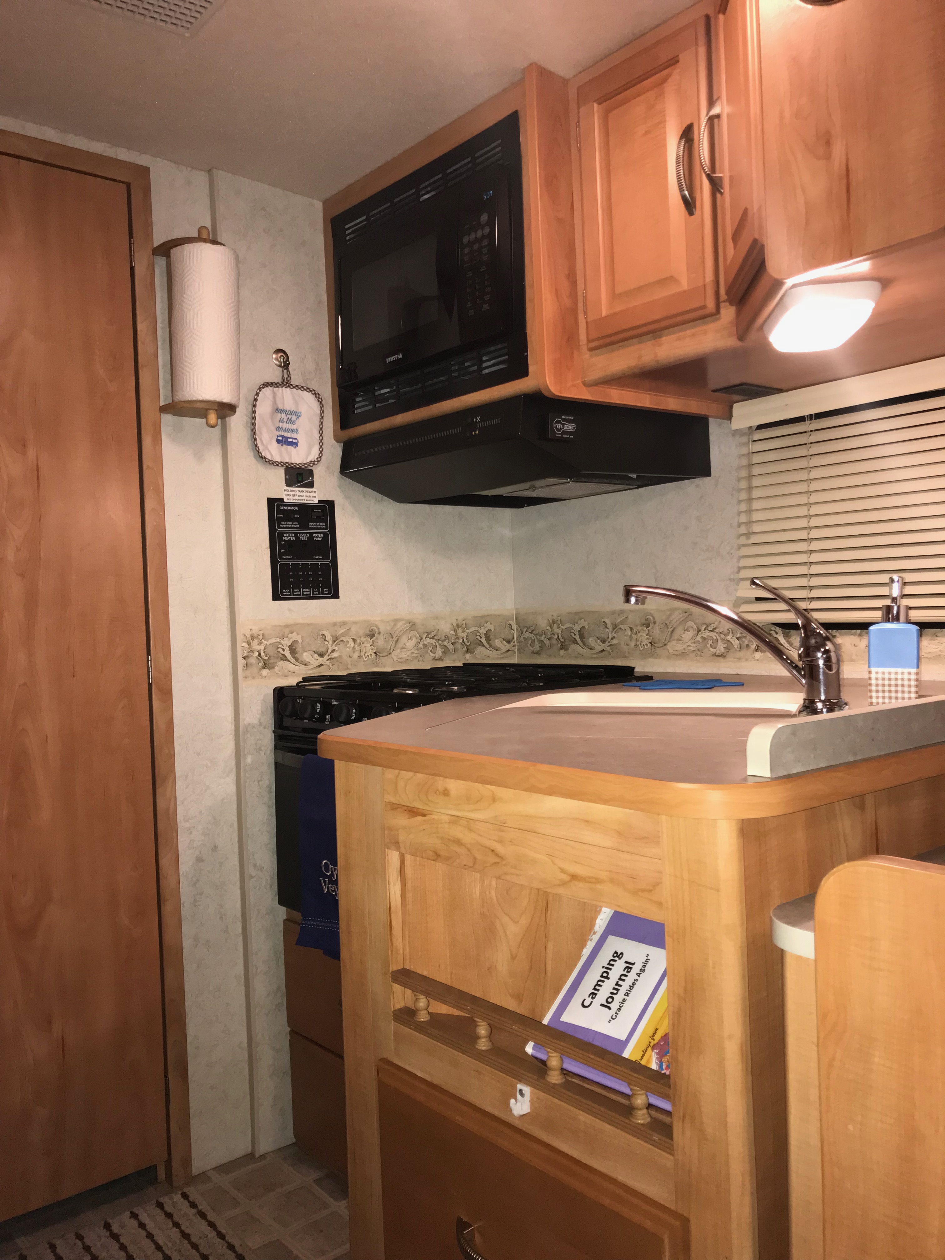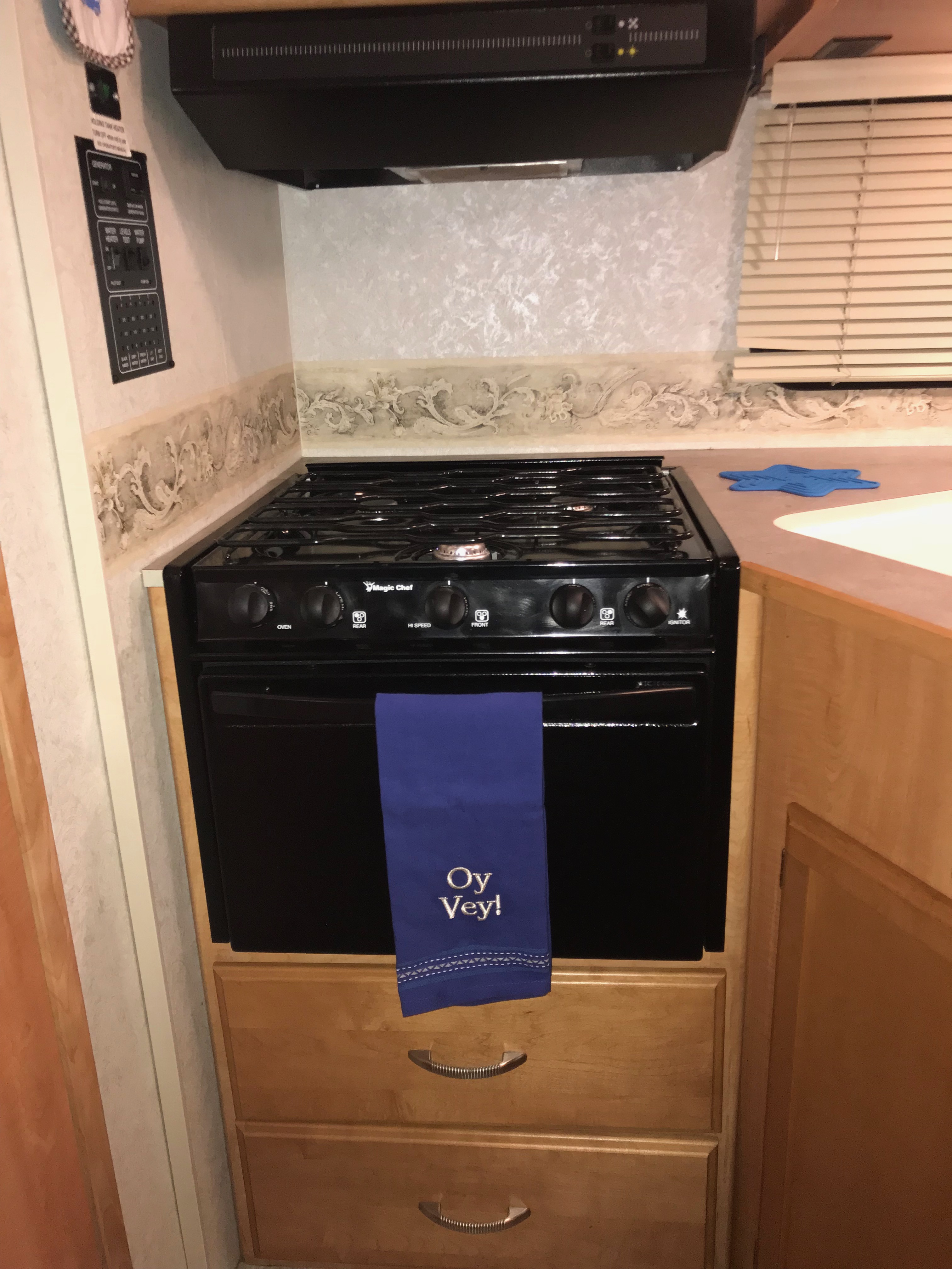 Yesterday, I headed to Dollar Tree to buy a lot of stuff so that I can stock the kitchen in the RV and last night I started to get things set up. I got a few cool items at our Judaica shop at the synagogue, including a Star of David trivet and a towel set, plus we made some purchases at Camping World the other day. All in all, she’s starting to come together. Now to just get rid of the ugly wallpaper border in the kitchen area!