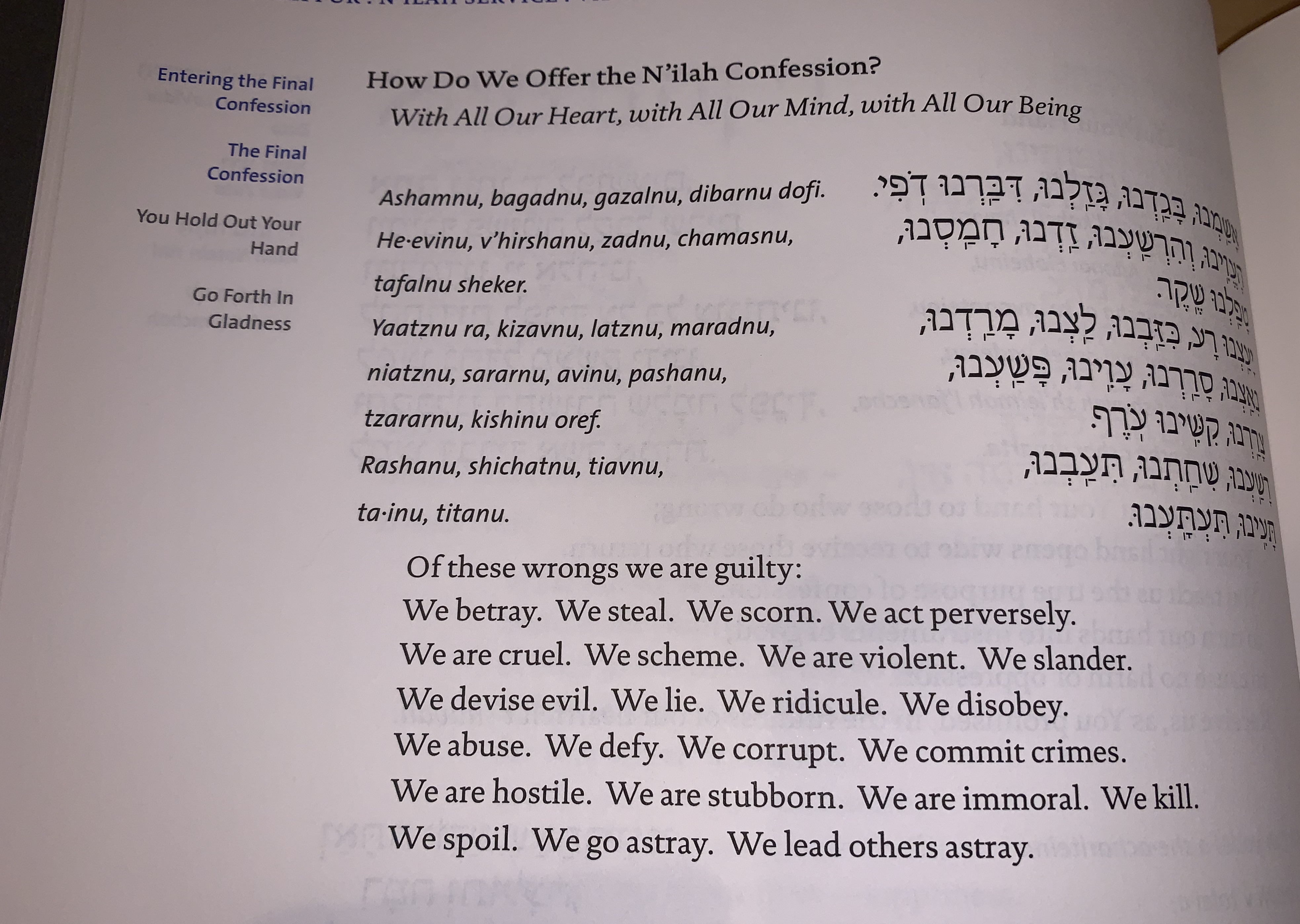 We Jews can be rather dramatic when we want to be, and this particular part of our service brings that drama to the forefront because, with the naming of each sin, we tap/thump/pound (depending on how hard we do it) our heart with our right fist to acknowledge that we, too, have committed these sins. Cantor chants the word or phrase in Hebrew and then we respond the same while we deliver a thump to the heart. This occurs three times throughout the day of Yom Kippur.