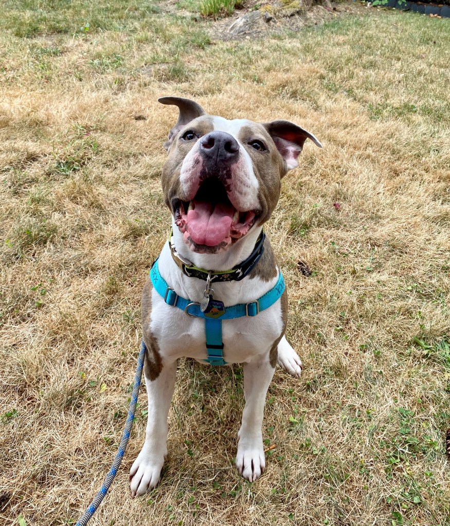 When we got there, we had to turn in our application and wait in the car (thanks, COVID). We went to meet one specific dog, and he was adopted while we were waiting. I was bummed, but a nice lady came out and said, “We have a dog in foster care that we really think you should meet.” She began to tell us about a 5-year-old Pit Bull named Mister, and how he had been in their system for five months. He was currently in a foster home because he could not function in their kennels. Due to that, there was very little interest in him. She explained that everyone there loved the dog, and they wanted him to find a home. I immediately rejected the idea because he was older than I wanted, and I wanted a dog that I could leave with that day. She promised me that his foster mom said he could be there in ten minutes if we wanted to meet him, so we said, “Yeah, why not?”