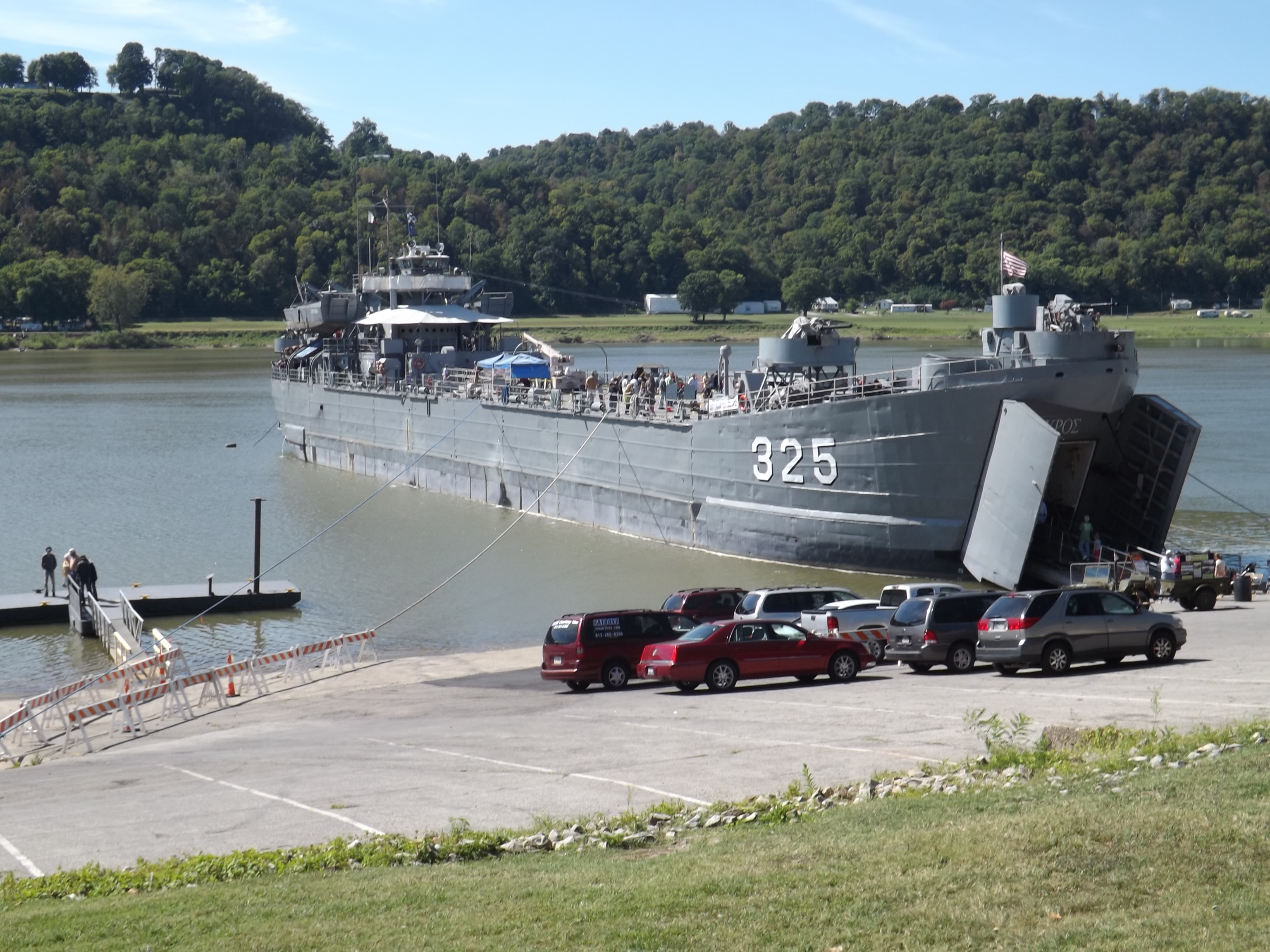 The LST-325 docked for tours at Madison, Indiana on 09/14/2013. This LST (Landing Ship, Tank) was used on D-Day +1 to offload tanks, trucks, jeeps, and troops at Omaha Beach and to transport injured soldiers back to England for care. It was utilized in Korea & Vietnam before being decommissioned and sold to the Greek government. When the Greeks were ready to scrap it, it was purchased by a group of veterans who have worked to restore her as she was during World War II. Her home port is Evansville, IN, but she sails during the summer so that others may board her and explore a piece of history.